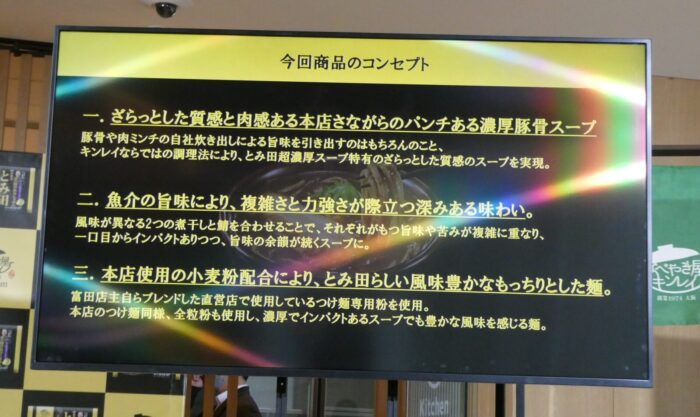 ①ざらッとした質感と肉感のスープで本店さながらの味わいをキンレイの技術力で再現、⓶魚介の旨味を合わせて、旨味、苦みが複雑に重なるスープ、③富田店主がブレンドした専用粉を使用、本店同様全粒粉も使用して、「風味豊かなもっちり麺」を再現、という3つのコンセプトです。