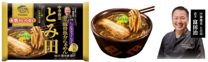 「中華蕎麦とみ田」(富田治店主)は、千葉県松戸市に本店を構える日本最高峰のラーメン店。同店監修の新商品は、お店で人気のつけ麺の味わいを再現したラーメンです。スープはざらッとした質感の濃厚豚骨に、風味が異なる2つの煮干しと鯖を合わせて、旨味重なるガツンとした味わい。別添の「柚子七味」を加えると、濃厚なスープが引き締まって、ひと味違ったおいしさが楽しめます。