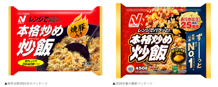 ニチレイフーズの「本格炒め炒飯®」は、2026年3月に発売25周年を迎えました。発売当初のパッケージと現在のパッケージを比較すると、時代の変遷を感じます。パラッパラの表現力が違いますね。