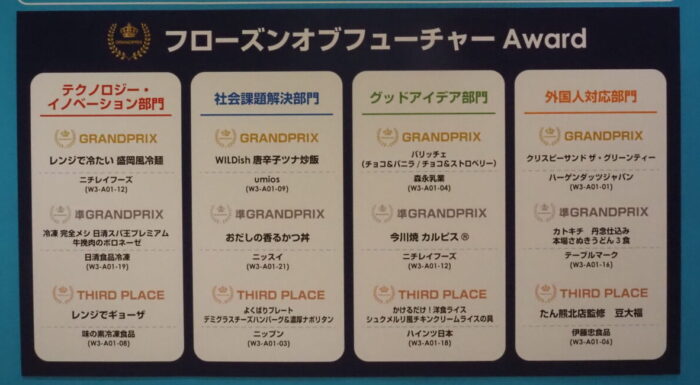FOODEX JAPAN 2026(3月10日~13日、東京ビッグサイト)、FOODEX Frozen企画展会場で会期2日目の3月11日、新提案商品のアワード「フローズンオブフーチャー」の公開審査、表彰式が行われました。写真㊤は部門グランプリを受賞した4社。(左から)社会課題解決部門「Wildish唐辛子ツナ炒飯」:Umios(マルハニチロ)、テクノロジー・イノベーション部門「レンジで冷たい盛岡風冷麺」:ニチレイフーズ、グッドアイデア部門「パリッチェ(チョコ&バニラ/チョコ&ストロベリー):森永乳業【アイス】、外国人対応部門「クリスピーサンド ザ・グリーンティー」:ハーゲンダッツジャパン【同】。