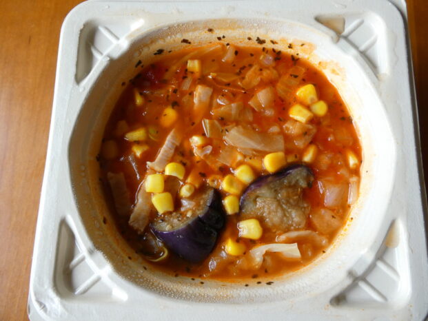 写真㊤はレンジ加熱後。深さは約5cmです。ミネストローネ以外のスープメニューや、シチュー、カレーなどにもメニューが広がっていきそうです。