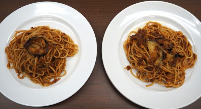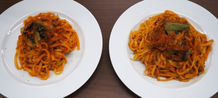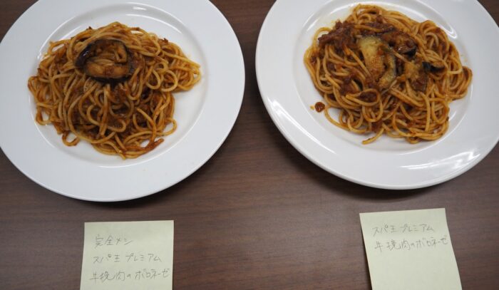 まずは、日清食品冷凍社内で“マザー商品”と読ばれている「冷凍 完全メシ」じゃない方、「冷凍 日清スパ王プレミアム 牛挽肉のボロネーゼ」から食べました。いつものおいしさです。そして、「冷凍 完全メシ 日清スパ王プレミアム 牛挽肉のボロネーゼ」を食べます。あれ?普通においしい。え~!?違いが分からないって何だか悔しい~、というのが、思わず出てきた率直な感想でした。