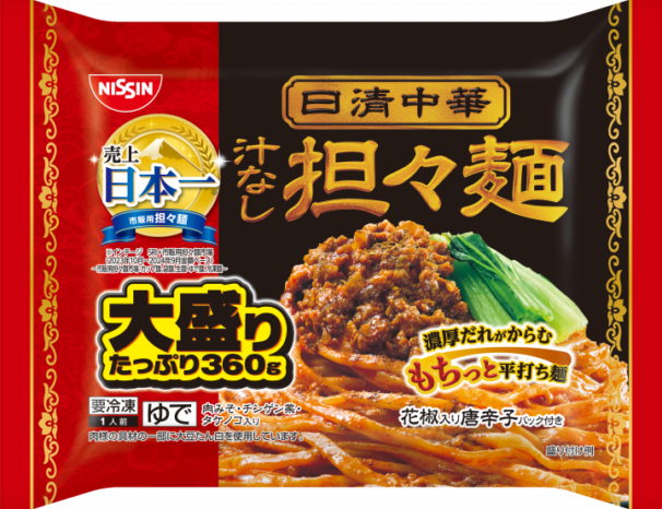 「冷凍 日清中華 汁なし担々麺 大盛り」と「冷凍 完全メシ 日清中華 汁なし担々麺」。これは見た目の量で分かりますね。