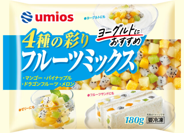冷凍食品ジャーナリストという仕事柄、好きな冷凍食品は?とか、常備している冷凍食品は何?といった質問をよく受けます。常備しているもののひとつに、冷凍フルーツ、特に「3種のベリーミックス」が気に入っているのですが、そのメーカー、Umios(ウミオス:3月にマルハニチロから社名変更)が、嬉しい新フルーツミックスバリエーションを発売しました。「4種の彩りフルーツミックス」(180g)です。マンゴー、パイナップル、ドラゴンフルーツ、メロンの4種類を小さめダイスカットにしてミックスしています。ベトナムの協力工場生産品。