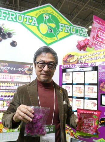 日本アクセスのフードコンベンション会場で、新商品をPRする長澤誠社長。アサイーに続く人気商品に、という自信作です。