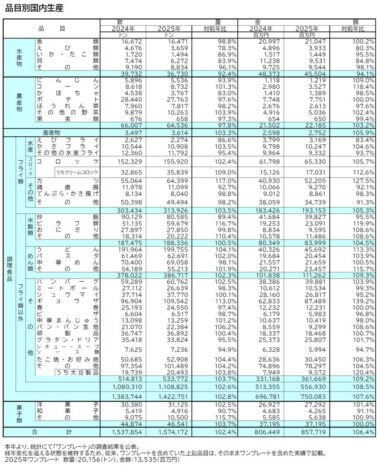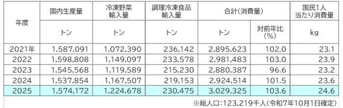(一社)日本冷凍食品協会(藤江太郎会長)がこのほど公表した「令和7年の冷凍食品の生産・消費調査結果」によると、2025年(1-12月)の冷凍食品国内生産量、生産金額(工場出荷額)ともに増加、冷凍野菜輸入量等も増加して、冷凍食品消費量は調査史上初めて300万トンを突破して302万9千トン(前年比103.6%)となりました。国民1人当たり年間消費量は前年より1.0kg増加して24.6kgです。