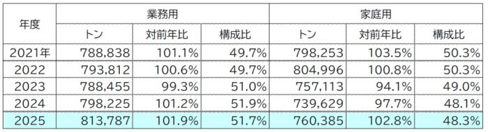 国内生産数量は、家庭用・業務用ともに増加しています。