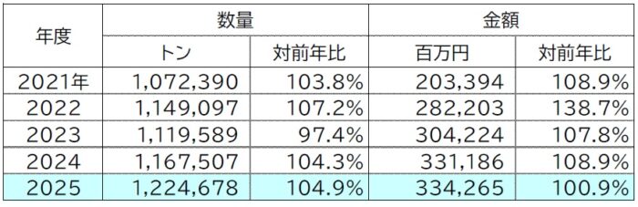2025年は前年比104.9%、122万4,678トンと、ついに120万トン台になりました。調理冷凍食品輸入量(冷食協会員のみ集計)23万トンと合わせて、145万トン超の輸入量となり、国内生産量157万トンに12万トン差と迫る数値になりました。