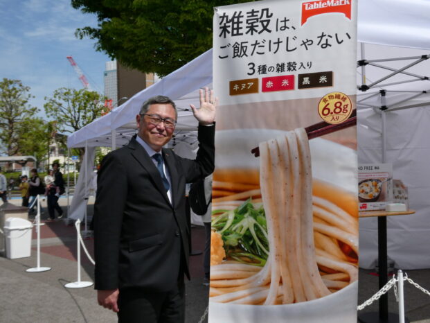『BEYOND FREE』の試食イベントは、昨年秋に同会場で実施した「雑穀ライスバーガー」に続いて2回目。天候にも恵まれて注目を集めた試食会場でした。武田淳一BEYOND FREE推進室長は、「BEYOND FREEブランドは3年目。これまで、“即食”できる商品ばかりでしたが、今回は初の素材麺。テーブルマークブランドを見て、広く一般の方々にも、試していただくのが狙いです」とのこと。