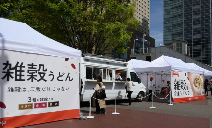 テーブルマークの植物由来の冷凍ミールブランド『BEYOND FREE(ビヨンドフリー)』から今春新商品、3種の雑穀を使用した「雑穀うどん キヌア・赤米・黒米入り」(540g/3食入り)発売されました。同ブランドでは初めてのうどん。“冷凍麺のテーブルマーク”のチャレンジ商品をPRする試食イベントが、4月18日と19日の土・日曜日、JR桜木町駅前広場(横浜市)で開かれました。