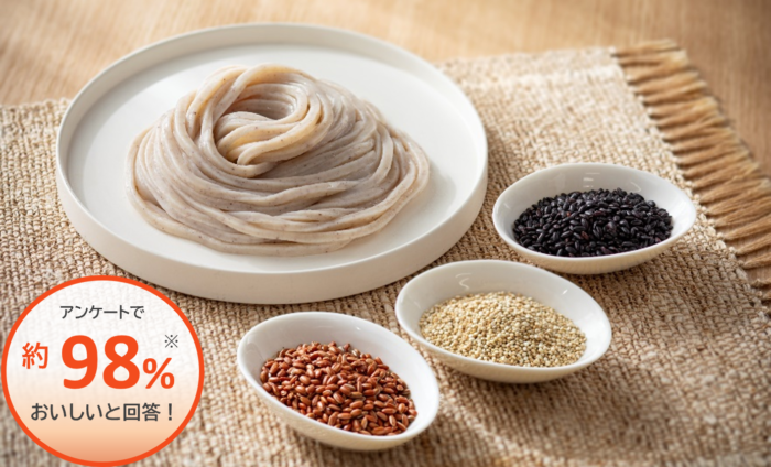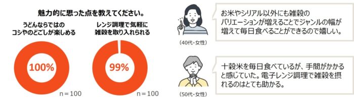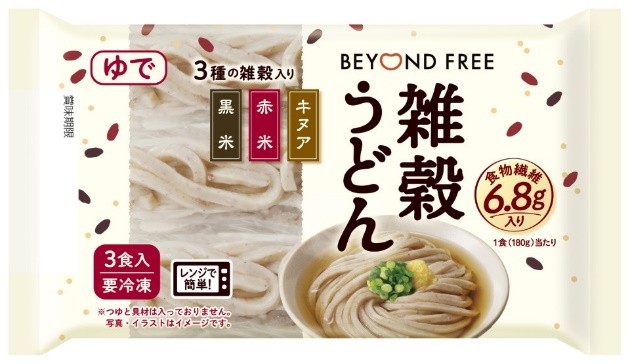 同社では発売にあたり、30~60代の男女110名を対象に、雑穀に対するイメージ調査および試食調査を実施。それによると、雑穀に対しては、過半数以上の方が「健康的なイメージがある」と好意的に受け止めている一方で、「日常の食生活に取り入れにくい」「何を選べばよいかわからない」といった意見も多く、新商品は、そんなハードルを低くする、「冷凍うどん」です。冷凍庫にストックでき、電子レンジ調理にも対応、つまり普通の冷凍うどんと同様の取り扱いで、日頃の食事に雑穀を手軽に取り入れることができます。