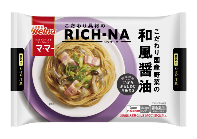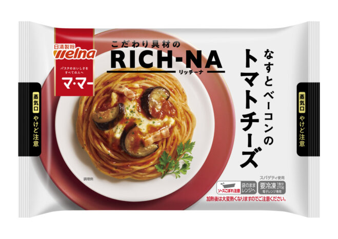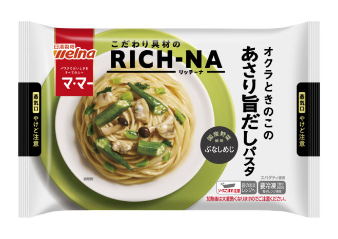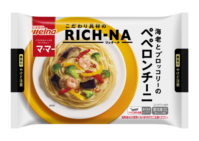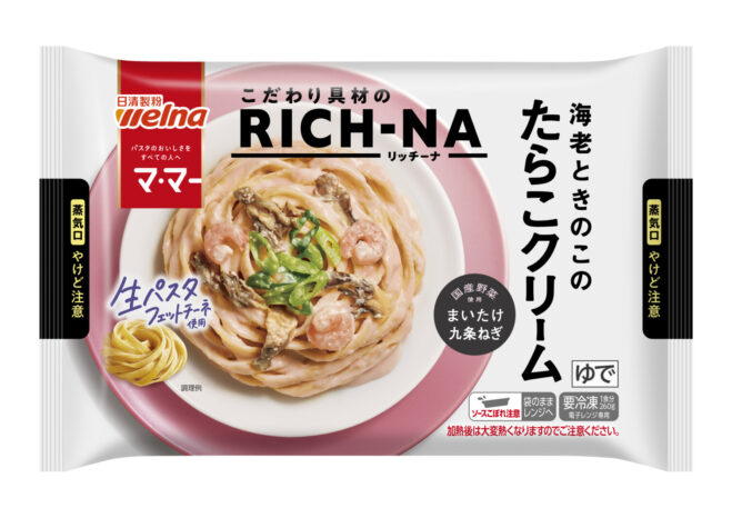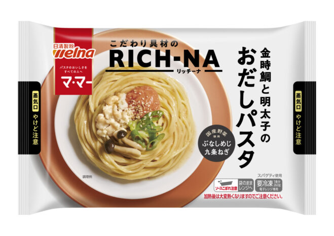 日清製粉ウェルナの2025年春家庭用冷凍食品新商品の目玉は、ちょっとリッチな個食パスタの新シリーズです。『マ・マー RICH=NA(リッチーナ)』ブランドとして「金時鯛と明太子のおだしパスタ」をはじめ7品を、3月3日から一挙全国新発売します。